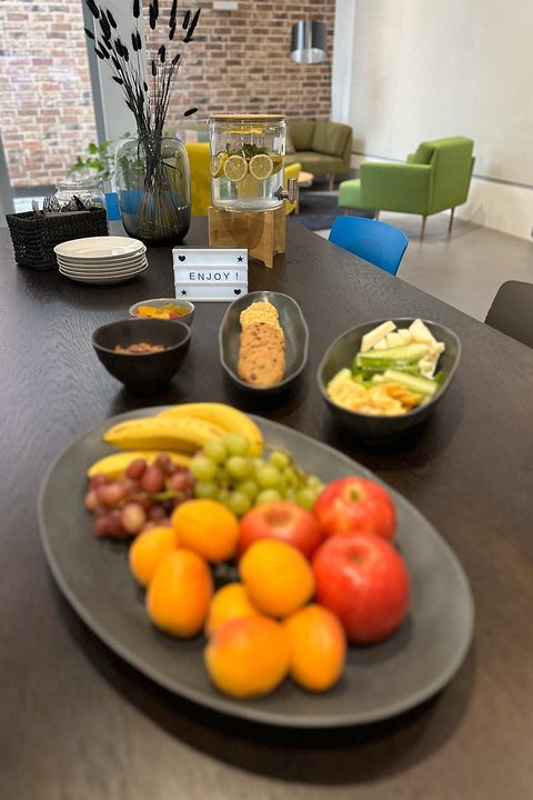 Ein Snack ist in der Getränkepauschale inklusive. Dieser beinhaltet wechselweise: Obst, Nüsse, Kekse und etwas Süßes und am Nachmittag Kuchen.